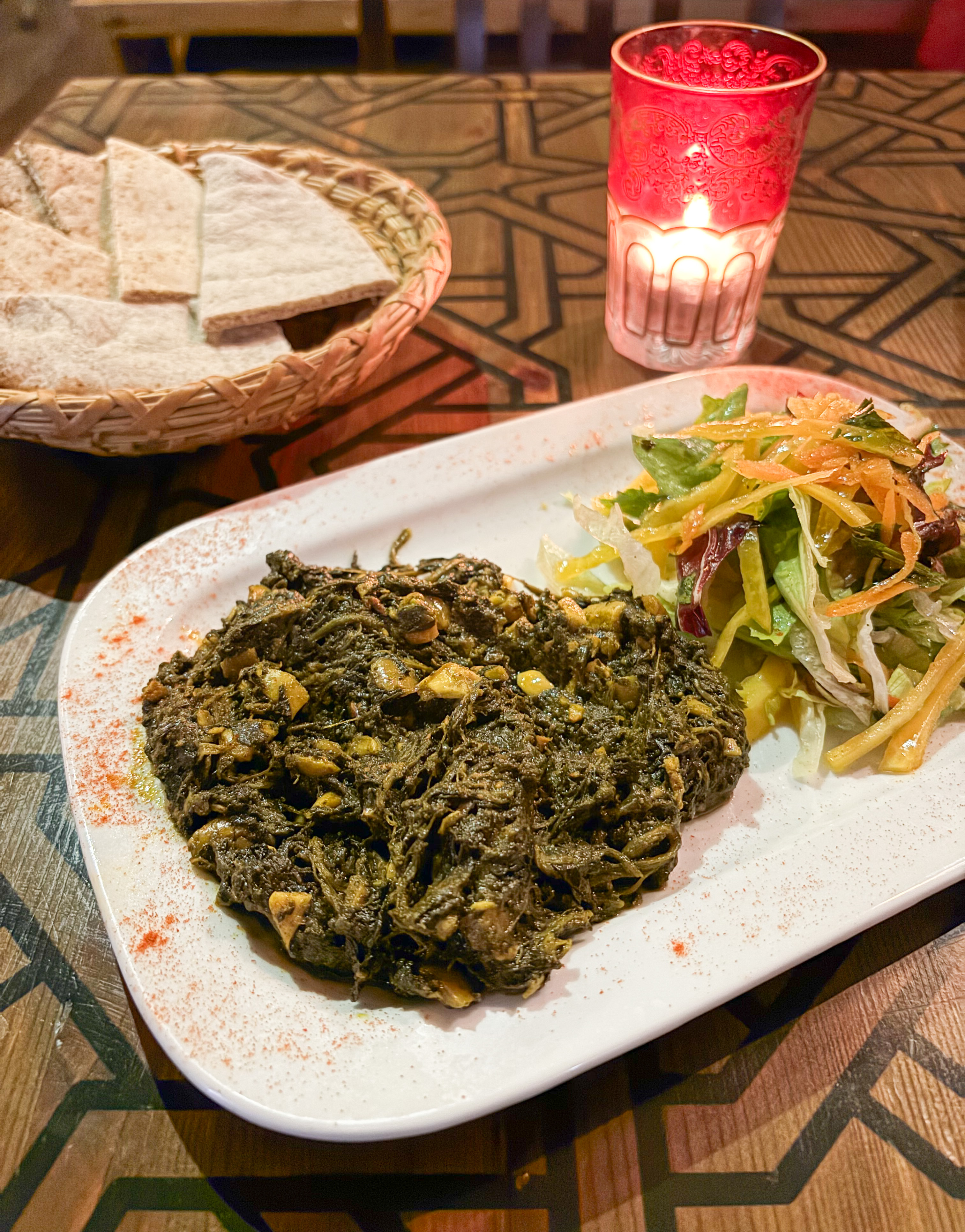 Few recipes can make spinach appetising enough to order at a restaurant, and the Arabic specialty khobiza is one of them. It’s found in both Palestine and Morocco, and Dada being a Moroccan restaurant does it full justice (the menu calls it fried spinach). Spinach leaves (the original recipe uses mallow leaves) are cooked with preserved lemon and spices like cumin to result in an almost mash-like dish that’s salty and slightly tart.