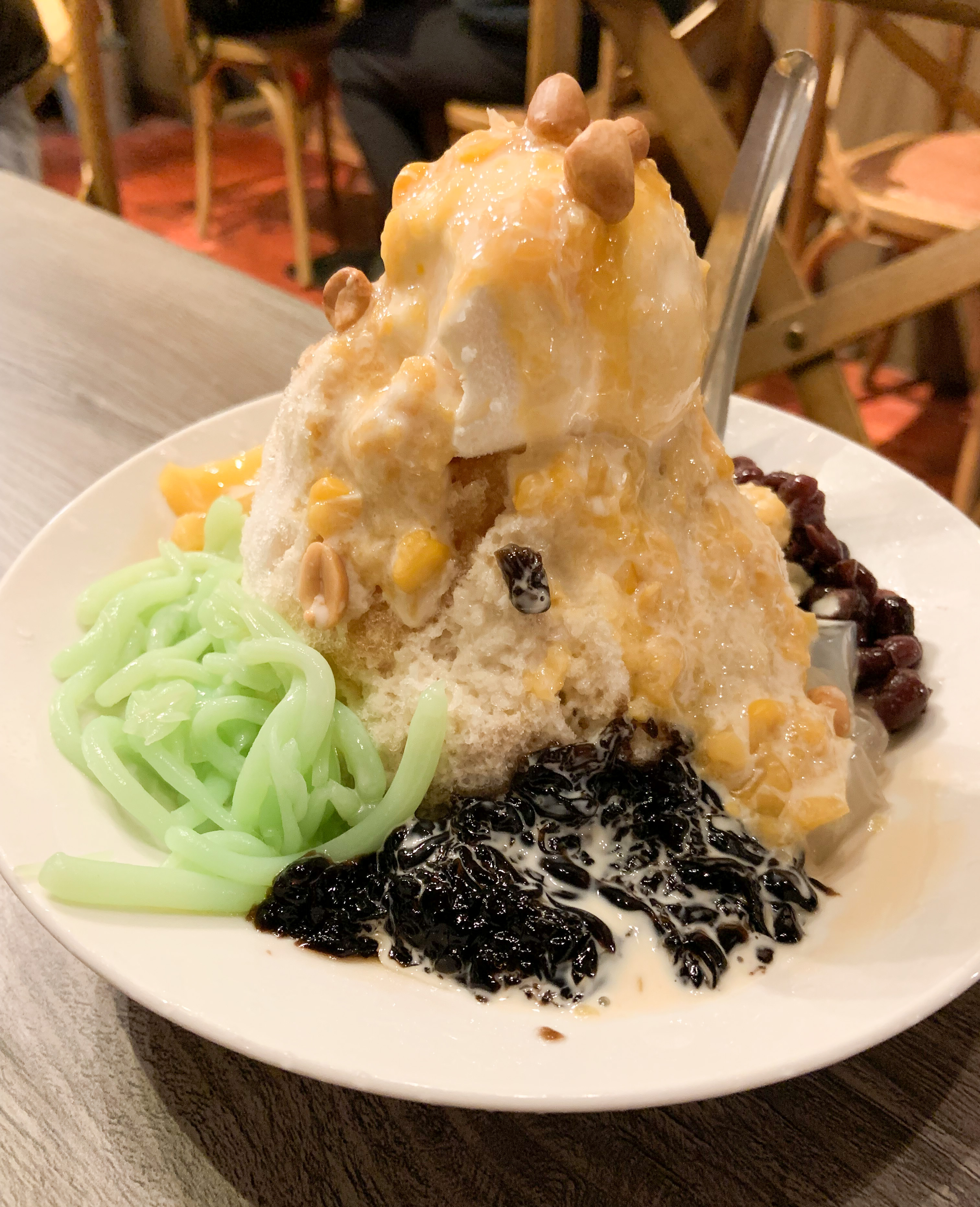 A mountain of finely shaved ice doused in evaporated milk and palm sugar is as tasty as it sounds, especially when accompanied by grass jelly, sweetcorn, cendol strands, red beans, peanuts, and ice cream. The dessert, popular in both Malaysia and Singapore, is a combination of diverse flavours and textures that work incredibly well together. Chewy jelly, crunchy sweetcorn, and milky ice cream result in lush mouthfuls.
