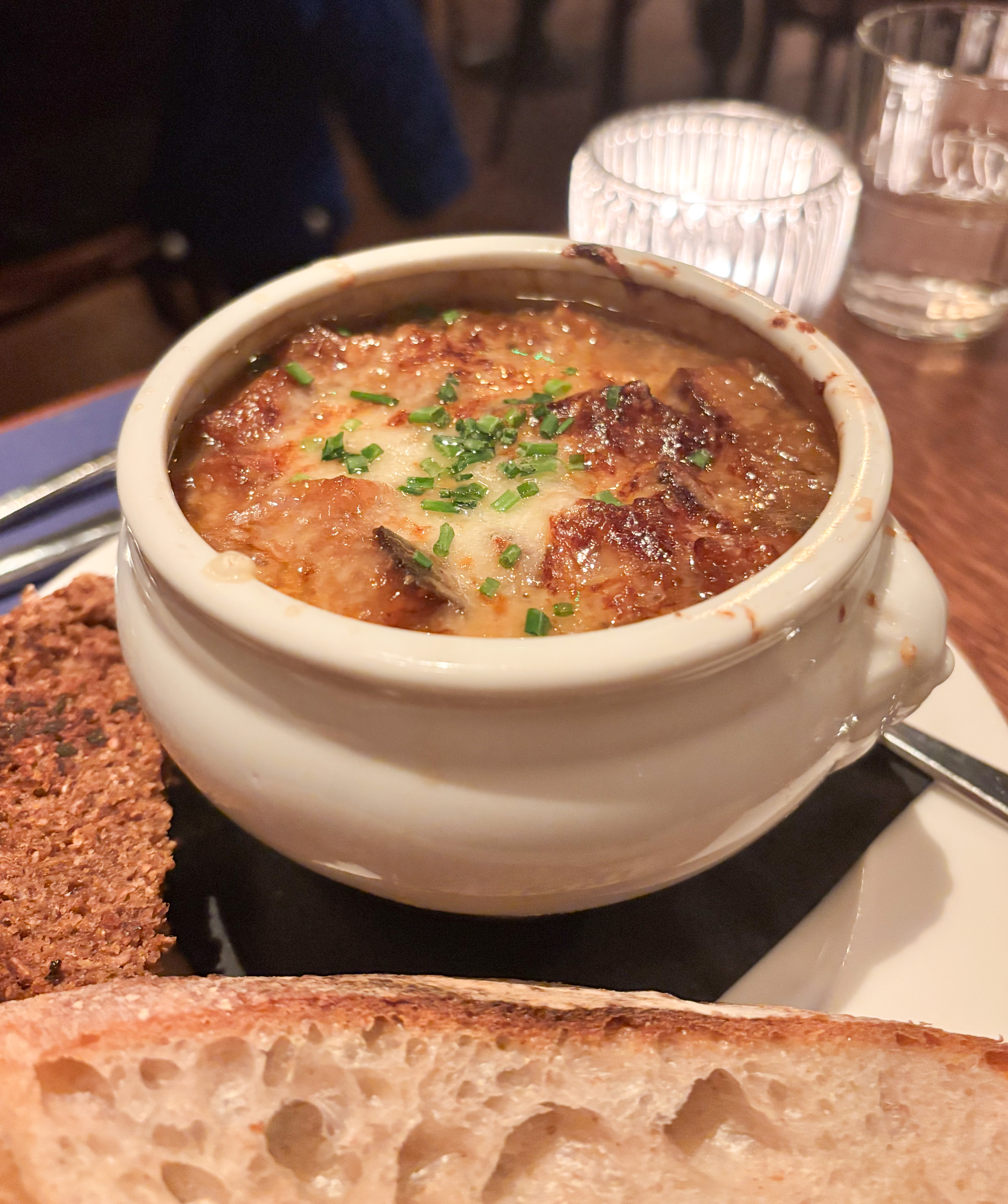 A fixture on both the brunch and dinner menu at L’Gueuleton, the classic onion soup is a hot bowl of sweet onions swimming in stock with melting comté. The cheese is dense enough to make its way into each spoonful, stringy from the heat. Chunky croutons — pleasantly soggy — add depth and volume, making the soup filling. While most bistro-style French restaurants have onion soup on their menu, L’Gueuleton really celebrates this representation of French cuisine.