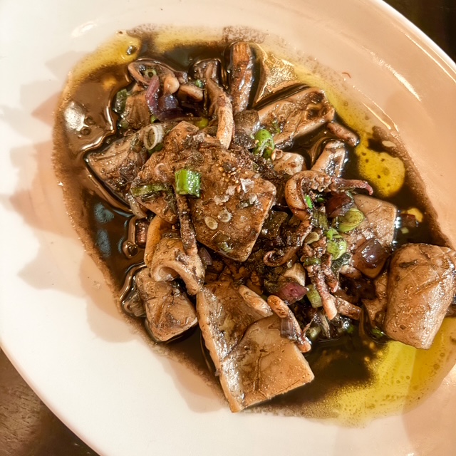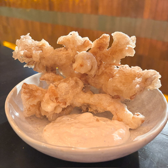 Inihaw na manok are chicken thigh skewers marinated in Bahay’s signature banana ketchup and grilled. As you slide piece after piece off the skewer, a distinct smoky flavour forms the majority of every bite. Sinigang, oyster mushroom tempura, is lighter than other tempura I’ve eaten. It’s a little bland on its own but achieves the right flavour with the accompanying salty, whipped tofu.