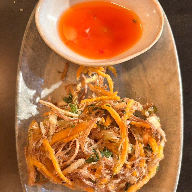 Pandesal, a pillowy bread roll served with roasted yeast butter, is a comforting place to start with the food. Biting into the pandesal is like what biting into clouds might feel like, the yeast butter serving as an appropriate accompaniment. The okoy, fritters made by deep-frying julienned and battered leek, kamote (sweet potato) and watercress, are served with sawsawan, a vinegar-based dipping sauce. It’s a starter that makes for audible crunching as you break off bits, dip them into the sawsawan and taste satisfying mouthfuls.