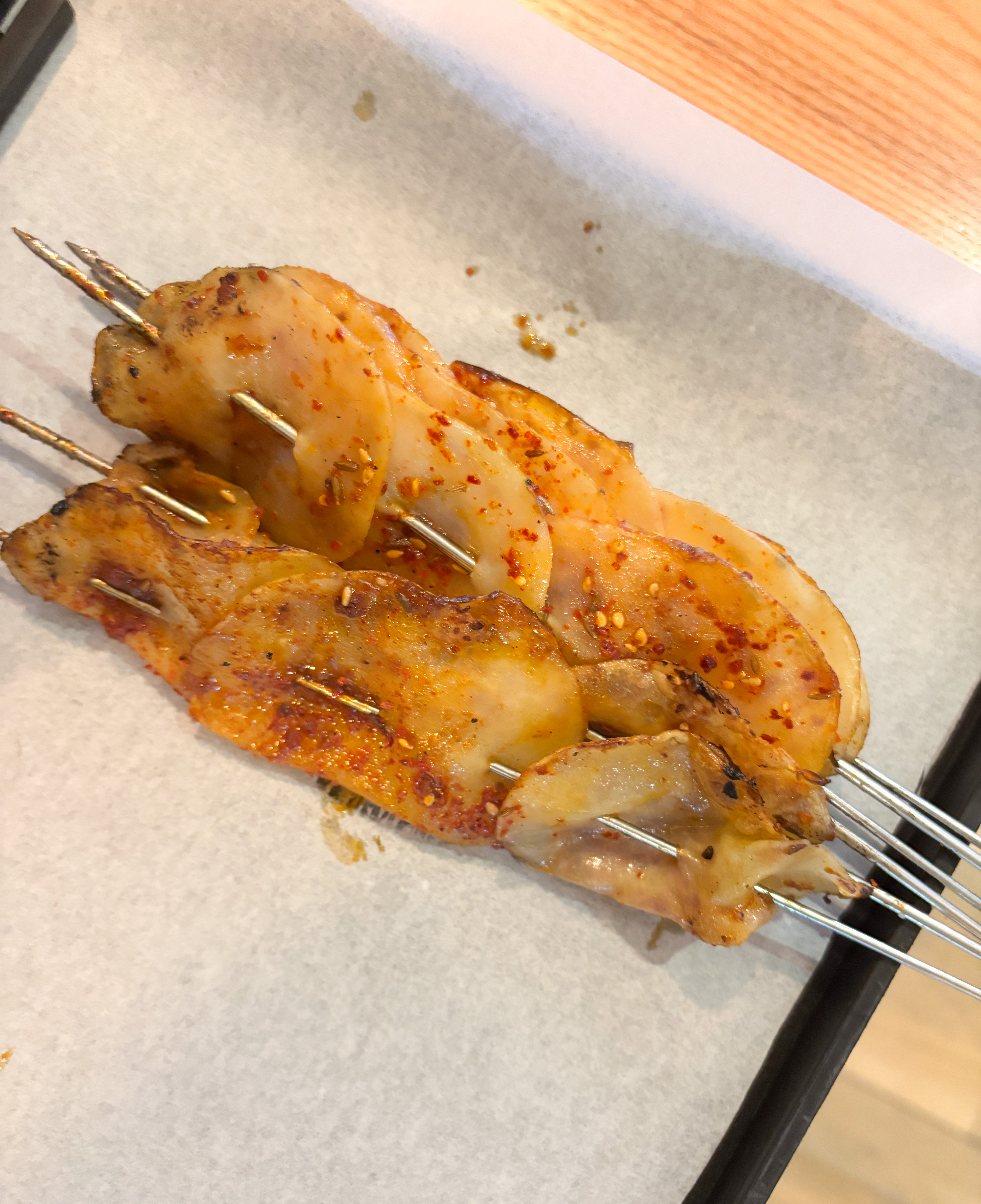 The serving and eating process is systematic. Staff continue to place skewers on a tray lined with parchment paper as they arrive, and we leave the empty skewers to be collected on one side.